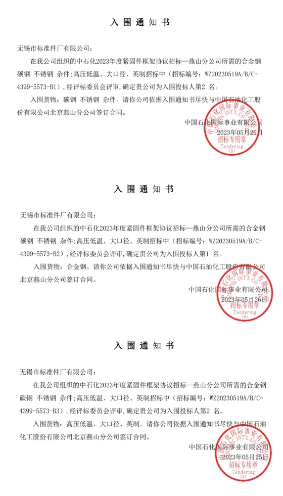 热烈庆祝:我司在“中石化2023年度紧固件框架协议招标”成为入围投标人!
